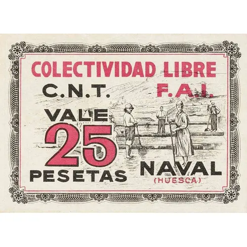 | Ön yüz lejandı | Colectividad Libre C.N.T F.A.I. VALE 25 PESETAS NAVAL (HUESCA) (Translation: Free Collectivity C.N.T F.A.I. Voucher 25 Pesetas Naval (Huesca)) |