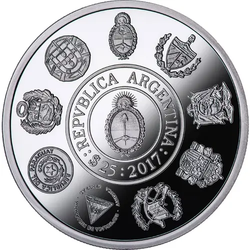 | Описание аверса | Of common design to all the currencies that integrate these series, it is distinguished in a central position the Argentine National Shield and the inscriptions `REPVBLICA ARGENTINA`, the face value `$ 25` and the year of coinage `2017`. Surrounding our emblem, it presents the shields of all the participating countries. Argentina, Cuba, Ecuador, Spain, Guatemala, Nicaragua, Paraguay, Peru, and Portugal. |