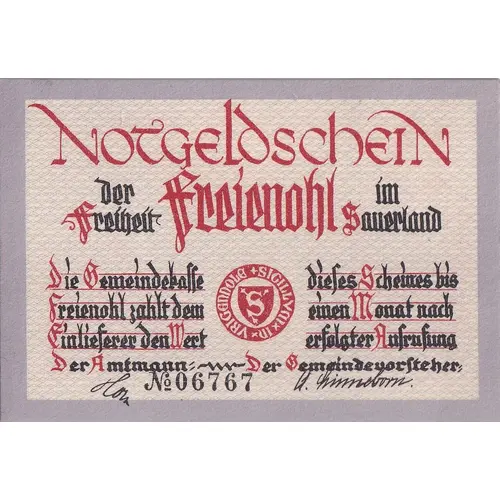 | صادرکننده | Municipality of Freienohl (Prussian province of Westphalia) |