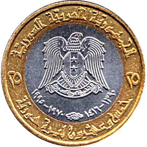 | Aversbeschreibung | Coat of arms of Syria: hawk of Quraish with two stars on the shield holding a scroll with the `Syrian Arab Republic` in Arabic lettering. Dates (AD left and AH right) in Arabic digits below. Value in Arabic digits (٢٥) on the left and on the right. |