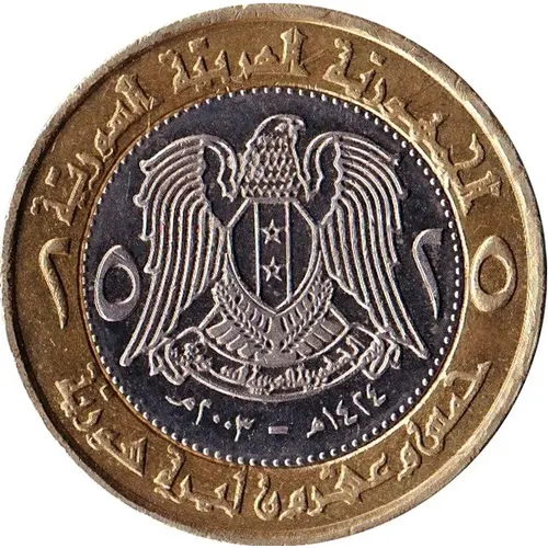 Obverse lettering الجمهورية العربية السورية ٢٥ ٢٥ ١٤٢٤ھ - ٢٠٠٣م خمس وعشرون ليرة سورية