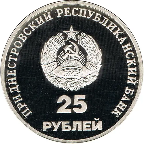 | Надписи аверса | ПРИДНЕСТРОВСКИЙ РЕСПУБЛИКАНСКИЙ БАНК 25 РУБЛЕЙ (Translation: Transnistrian Republican Bank 25 Rubles) |