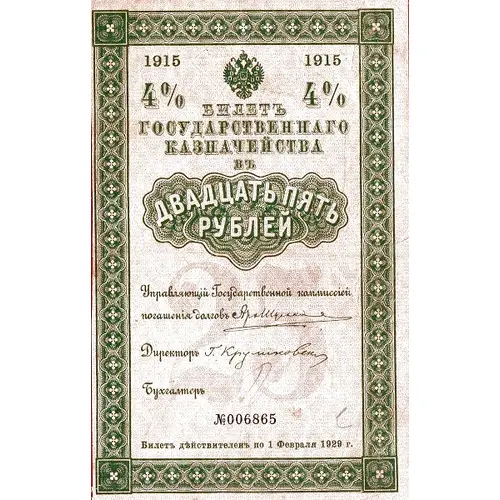 Положеніе о разрядѣ (серіи) билетовъ Государственнаго Казначейства за № CDLI (451). 1) Разрярдъ (серія) билетовъ Государственнаго Казначейства за № CDLI (451) на 25 милліоновъ рублей выпускается на четырехлѣтній срокъ. 2) Достоинство сихъ билетовъ опердѣляется въ 25 рублей, а размѣръ ежегоднаго дохода въ 4%. Доходъ уплачиваетея пополугодно, 1 Февраля и 1 Августа. Теченіе процентовъ по билетамъ начинается съ 1 Февраля 1915 г. 3) Доходъ отъ сихъ билетовъ Государственнаго Казначейства не подлежитъ сбору съ доходовъ отъ денежныхъ капиталовъ. 4) Форма билетовъ утверждается Министромъ Финансовъ. 5) Ногашеніе билетовъ пронзводится въ теценіе четырехъ лѣтъ со времени выпуска, послѣ чего билеты эти могутъ быть обмѣнены на новые. 6) Уплата процентовъ по билетамъ сего разряда производится во всѣхъ Казначействахъ и въ Конторахъ и Отдѣленіяхъ Госу- дарственнаго Банка предъявителямъ купоновъ за истекшія полугодія. 7) Вилеты Государственнаго Казначейства принимаются во всѣ платежи Государственному Казначейству и Государствен- ному Ванку, а также въ закоги по казеннымъ подрядамъ и поставкамъ и, вообще, по всѣмъ обязательствамъ съ казною—по нарицательной цѣнѣ. 8) При платежахъ билетами Казначействамъ и Государствен- ному Банку процецты по текущимъ купонамъ начиеляются до дня платежа; на этомъ же основаніи производятся эачеты и при продажѣ билетовъ Государственнымъ Банкомъ и Казначей- ствами частнымъ лицамъ и казеннымъ мѣстамъ, а сіи послѣднія по взаимнымъ расчетамъ дѣлаютъ зачеты тѣмъ же порядкомъ. Примѣчаніе. Способъ расчета между Государственнымъ Банкомъ и Государственнымъ Казначействомъ по билетамъ, принятымъ Государственнымъ Банкомъ, устанавливается Мини- стромъ финансовъ. 9) Къ платежу въ Казначействахъ и учрежденіяхъ Государ- ственнаго Банка билеты принимаются въ тѣхъ только скучаяхъ, когда они имѣютъ при себѣ всѣ купоны, сроки оплаты которыхъ еще не наступили, и когда платежная сумма не менѣе суммы билета съ наросшими процентами. 10) Билет сохраняютъ платежную силу въ продолженіе 10 лѣтъ послѣ истеченія четырехлѣтія, на которое они выпущены, а купоны этихъ билетовъ въ продолженіе 10 дѣтъ со дня, назначеннаго для ихъ оплаты. По истеченіи же указанныхъ 10-дѣтнихъ сроковъ не представленные къ платежу билеты и купоны признаются недѣйствительными. Процеты начисляются съ 1 Февраля тысяча девятьсотъ пятнадцатаго года. СЕРІЯ CDLI (ЧЕТЫРЕСТА ШЕСТЬДЕСЯТЪ ТРЕТЬЯ). |