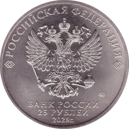 نوشته‌های روی سکه РОССИЙСКАЯ ФЕДЕРАЦИЯ ММД БАНК РОССИИ 25 РУБЛЕЙ 2025 г.