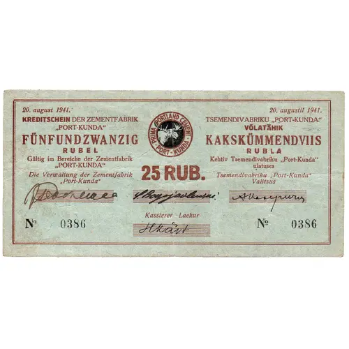 20. august 1941. KREDITSCHEIN DER ZEMENTFABRIK `PORT-KUNDA` FÜNFUNDZWANZIG RUBEL Gültig im Bereiche der Zementfabrik `PORT-KUNDA` Die Verwaltung der Zementfabrik `Port-Kunda` PRIMA PORTLAND CEMENT PORT-KUNDA 25 RUB. Kassierer Laekur 20. augustil 1941. TSEMENDIVABRIKU `PORT-KUNDA` VÕLATÄHIK KAKSKÜMMENDVIIS RUBLA Kehtiv Tsemendivabriku `Port-Kunda` ulatuses Tsemendivabriku `Port-Kunda` Valitsus (Translation: Credit note of the `Port-Kunda` Cement Factory 25 Rubel Valid within the `Port-Kunda` Cement Factory Board of the `Port-Kunda` Cement Factory Cashier) |
