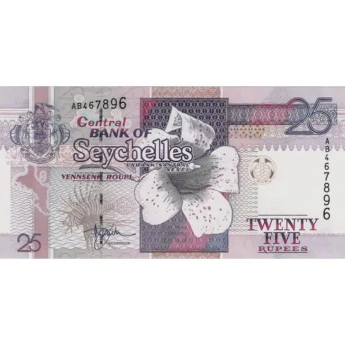 CENTRAL BANK OF SEYCHELLES LABANK SANTRAL SESEL VENNSENK ROUPI TWENTY FIVE RUPEES 25 |