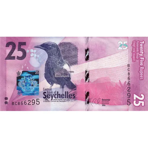 | Popis líce | Purple and violet. Seychelles magpie robin at center. Capucin plants at lower right. |