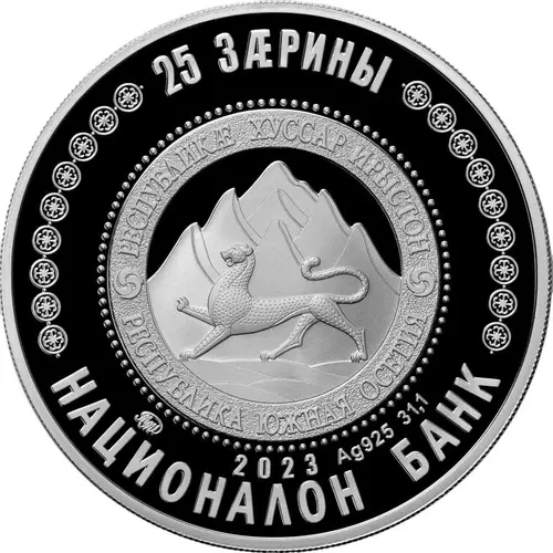 | Надписи аверса | 25 ЗÆРИНЫ РЕСПУБЛИКӔ ХУССАР ИРЫСТОН РЕСПУБЛИКА ЮЖНАЯ ОСЕТИЯ ММД 2023 Ag 925 31,1 НАЦИОНАЛОН БАНК |