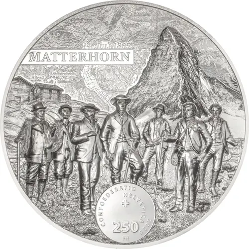 | Opschrift voorzijde | 14.JULI 1865 MATTERHORN CONFOEDERATIO HELVETICA 2025 250 FR (Translation: 14 JULY 1865 MATTERHORN Swiss Confederation 2025 250 FR) |