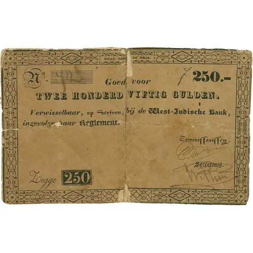 | Vorderseitenlegende | WEST-INDISCHE BANK Goed voor TWEE HONDERD VYFTIG GULDEN. Verwisselbaar, op vertoon, bij the West-Indische Bank, ingevolge haar Reglement. ZEGGE 250 (Translation: West Indies Bank Good for Two Hundred and Fifty Gulden. Interchangeable, upon presentation, at the Western Indies Bank, pursuant to her Regulations. Say 250) |