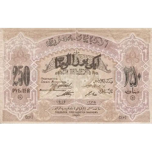 Reverse lettering АЗЕРБАЙДЖАНСКАЯ РЕСПУБЛИКА اللي منات ДВѢСТИ ايكي يوز   ПЯТЬДЕСЯТЪ    РУБЛЕЙ 250   ۲۵۰ РУБЛЕЙ منات ИМѢЕТЪ ХОЖДЕНІЕ НАРАВНѢ СЪ РОССІЙСКИМИ КРЕДИТНЫМИ БИЛЕТАМИ