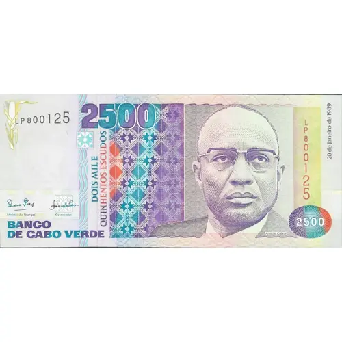 | Ön yüz lejandı | BANCO DE CABO VERDE 2500 DOIS MIL E QUINHENTOS ESCUDOS 20 de Janeiro de 1989 (Translation: Bank of Cape Verde Two Thousand and Five Hundred Escudos January 20, 1989) |