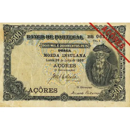 | Obverse lettering | BANCO DE PORTUGAL DOIS MIL E QUINHENTOS REIS PRATA MOEDA INSULANA Lisboa 30 de Julho de 1909 AÇORES (Translation: Bank of Portugal Two Thousand and Five Hundred Reis Silver Island currency Lisbon, July 30, 1909 Azores) |