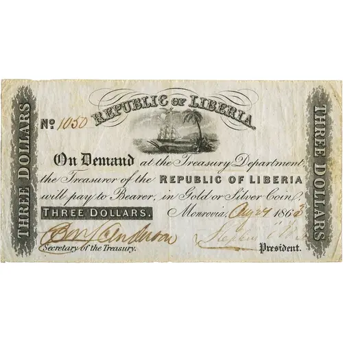 | Obverse lettering | REPUBLIC OF LIBERIA ON DEMAND AT THE TREASURY DEPARTMENT THE TREASURER OF THE REPUBLIC OF LIBERIA WILL PAY TO BEARER IN GOLD OR SILVER COIN THREE DOLLARS |