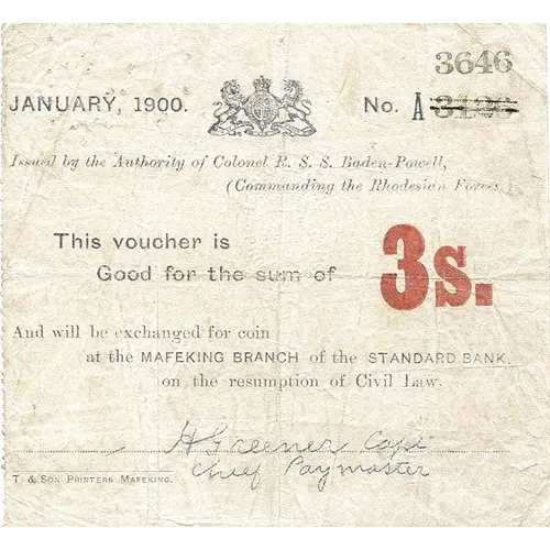 | Obverse lettering | JANUARY 1900 No. A 3646 Issued by authority of Colonel R. S. S. Baden-Powell (Commanding Rhodesian Forces) This voucher is Good for the sum of 3s. And will be exchanged with for coin at the MAFEKING BRANCH of the STANDARD BANK, on the resumption of Civil Law. T. & Son Printers Mafeking |