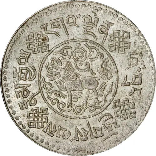 Opis awersu Snow lion facing left with scroll ornaments around, all surrounded four identical Buddhist auspicious symbols (an endless knot) and Tibetan characters.
