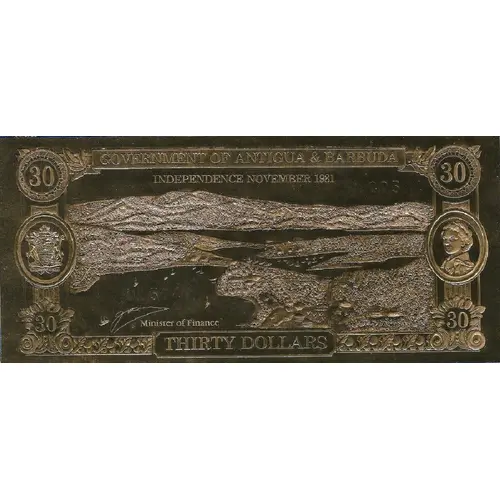 | Надписи лицевой стороны | 30 GOVERNMENT OF ANTIGUA & BARBUDA 30 INDEPENDENCE NOVEMBER 1981 Minister of Finance 30 THIRTY DOLLARS 30 |
