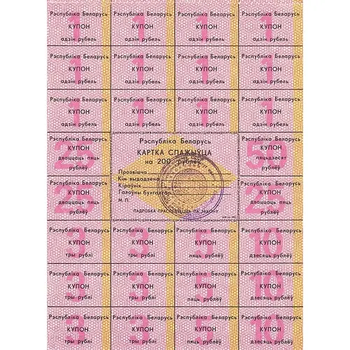 | نوشتههای روی اسکناس | Рэспубліка Беларусь КАРТКА СПАЖЫЎЦА на 200 рублёў Прозвішча __________ Кім выдадзена __________ Кіраўнік __________ Галоўны бухгалтар __________ М. П. ПАДРОБКА ПРАСЛЕДУЕЦЦА ПА ЗАКОНУ (Translation: Republic of Belarus, Consumer card for 200 Rubles, Last name/Issuing authority/Administrator/Chief accountant, Counterfeit is prosecuted by law) |