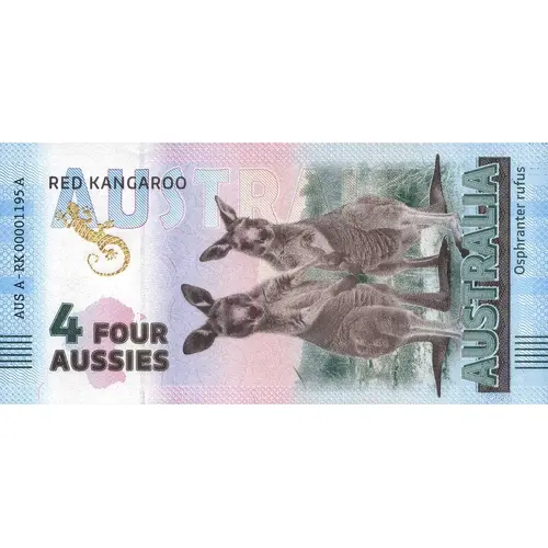 ULURU / AYERS ROCK 4 FOUR AUSSIES THIS NOTE IS NOT LEGAL TENDER, BUT A UNIQUE COLLECTOR`S ITEM AND A TRIBUTE TO THE DIVERSE FAUNA OF AUSTRALIA. |