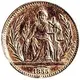 Seated woman (Liberty) with symbols of peace (olive branch) and justice (sword and scales) with year of issue below |