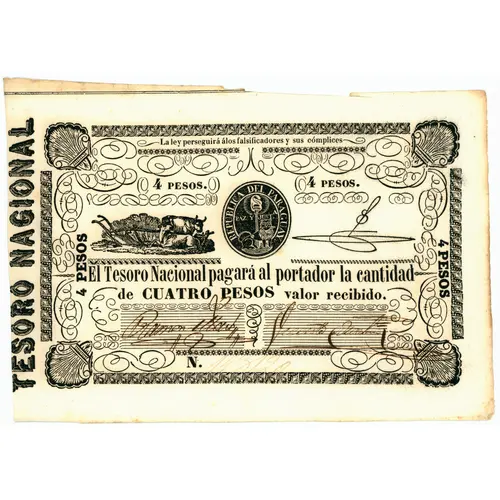 La ley perseguirá álos falsificadores y sus cómplices 4 PESOS. 4 PESOS. El Tesoro Nacional pagará al portador la cantidad de CUATRO PESOS valor recibido. (Translation: The law will prosecute counterfeiters and their accomplices 4 Pesos. 4 Pesos. The National Treasury will pay to the bearer the amount of Four Pesos received value.) |