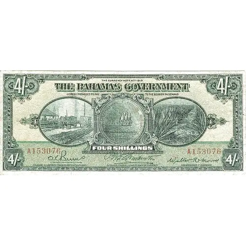 4/- THE CURRENCY NOTE ACT 1919 THE BAHAMAS GOVERNMENT HEREBY PROMISES TO PAY TO THE BEARER ON DEMAND FOUR SHILLINGS SIGILLUM PROVIDENTIA C^ETERARUMQUE BAHAMA INSULARVM EXPULSIS PIRATIS RESTITUTA COMMERCIA FOUR 4 COLONIAL SECRETARY, COMMISSIONER OF CURRENCY. RECEIVER GENERAL, COMMISSIONER OF CURRENCY. COMMISSIONER OF CURRENCY (Translation: Seal of Providence and other Bahamas Islands. Pirates expelled, commerce restored.) |