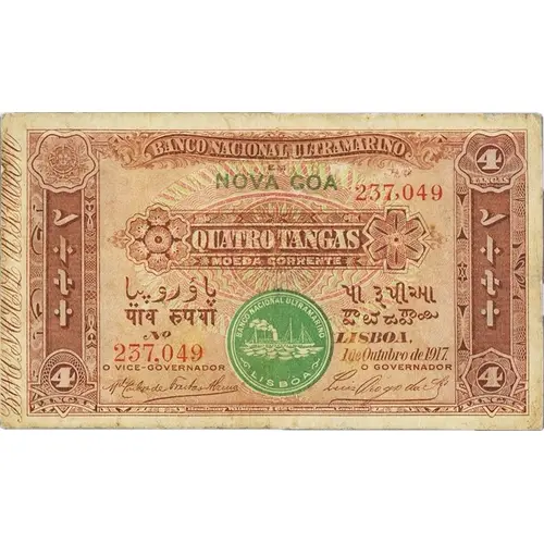 | 表面の銘文 | BANCO NACIONAL ULTRAMARINO EM NOVA GOA QUATRO TANGAS MOEDA CORRENTE LISBOA, 1 de Outubro de 1917. (Translation: National Bank Overseas in Nova Goa Four Tangas in currency Lisbon, October 1st., 1917.) |