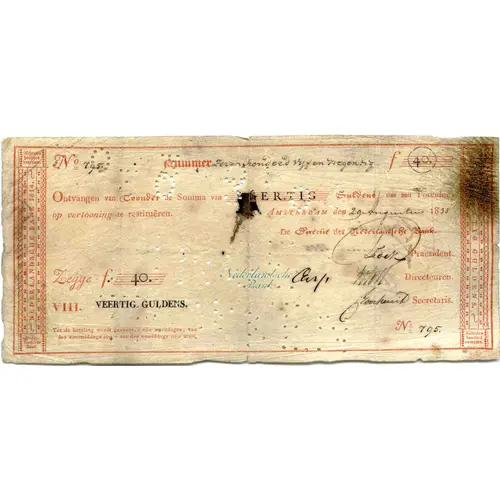 NEDERLANDSCHE BANK. Ontvangen van Toonder de Somma van VEERTIG Guldens / om aan Toonder, op vertooning te restituëren. Amsterdam, den 29 Augustus 1835. Nederlandsche-Bank 1814. President - Directeur - Secretaris Legge f 40. VII. VEERTIG GULDENS. (Translation: Bank of Netherlands. Received from Bearer the Somma of a Forty Guilders, to restimese to Bearer upon presentation. Amsterdam, the August 29, 1835. Bank of Netherlands 1814. President - Director - Secretary 40) |