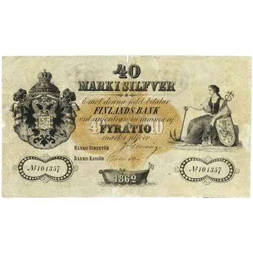 | Opis rubu | 40 MARKKAA HOPEASSA Tästä setelistä maksaa Suomenmaan Pankki vaadittaissa NELJÄKYMMENTÄ markkaa hopeassa. 40 МАРКЪ СЕРЕБРОМЪ Предъяьителю сего Финляндскій Банкъ ьыдаетъ СОРОКЪ маркъ серебромъ Tämän Setelin väärentäminen tahi muukaaminen, kiun myöskin semmosen rahan kauppaaminen, rangaistaan Marraskuun 2 (14) päivänä 1812 annetun Keisarillisen asetuksen jälkeen. (Translation: 40 MARKS IN SILVER From this banknote, the Bank of Finland will pay, on demand, FORTY marks in silver. [Small text at bottom, in Swedish, Finnish, and Russian] The forgery or alteration of this Banknote, as well as the trading of similar money, will be punished under the Imperial decree issued on November 2 (14) 1812.) |