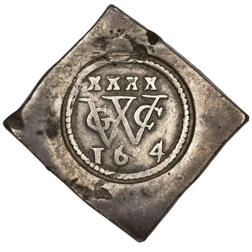 | 表面の説明 | GWC monogram in the center with value XXXX and date 1654, inside a circle of pearls. |