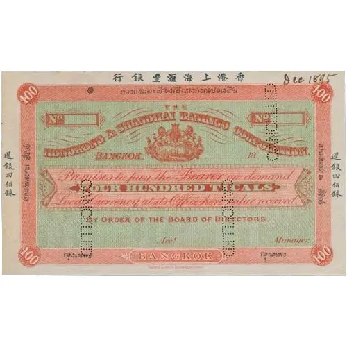 | Leyenda del reverso | ๔๐๐ ๔๐๐ ฮองกงและเชียงไฮ้แบงกิงกอปอเรชัน สัญญกว่า เมื่อผู้ ใด หนึ่ง } ได้นํฃหนังสือสำคัญฉบับนี้ มายื่นทิ่ห้างข้าทเจ้าในหัวเมืองนี้แล้ว ฃา้ทเจา้จะใช้ เงินให้แก่ผู้นั้นในทันใด เปนเงินสยาม สี่ร้อย บาท โดยบัญท่แห่งผู้บังคัปการนี้ กรุงเทพฯ ๔๐๐ ๔๐๐ |
