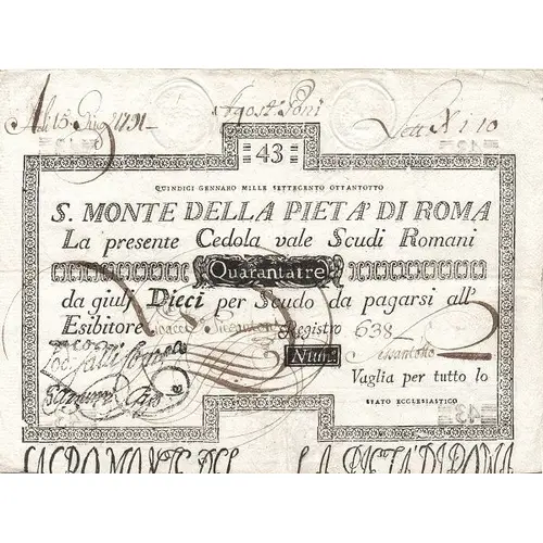 Obverse lettering 43 QUINDICI GENARRO MILLE SETTICENTO OTTANTOTTO S. M. DI PIETA DI ROMA La presente Cedola vaglia Scudi Romani Quarantatre da giulj dieci per Scudo da pagarsi all` Esibitore.