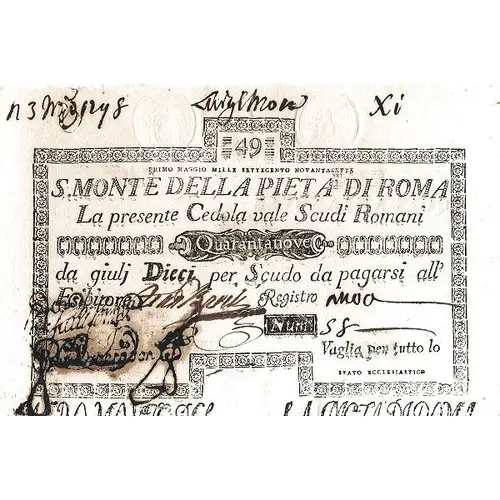 | Legenda awersu | 49 PRIMO MAGGIO MILLE SETTECENTO NOVANTASETTE S. M. DI PIETA DI ROMA La presente Cedola vaglia Scudi Romani Quarantanove da giulj dieci per Scudo da pagarsi all` Esibitore. |