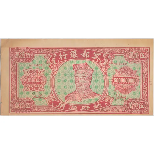 | Opschrift voorzijde | NO. 8459 5000000000 冥都銀行 伍億萬 地府通用 Yuen Lion Y. Wong |