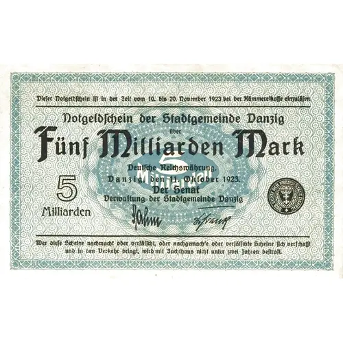 | Légende de l’avers | Dieſer Notgeldſchein iſt in der Zeit vom 5. bis 10. Oktober 1923 bei der Kämmereikaſſe einzulöſen. ⸻ Notgeldſchein der Stadtgemeinde Danzig über Fünf Milliarden Mark Deutſche Reichswährung. Danzig, den 11. Oktober 1923. Der Senat Verwaltung der Stadtgemeinde Danzig 5 Milliarden ⸻ Wer dieſe Scheinenachmacht oder verfälſcht, oder nachgemachte oder verfälſchte Scheine ſich verſchafft und in den Verkehr bringt, wird mit Zuchthaus nicht unter zwei Jahren beſtraft, |