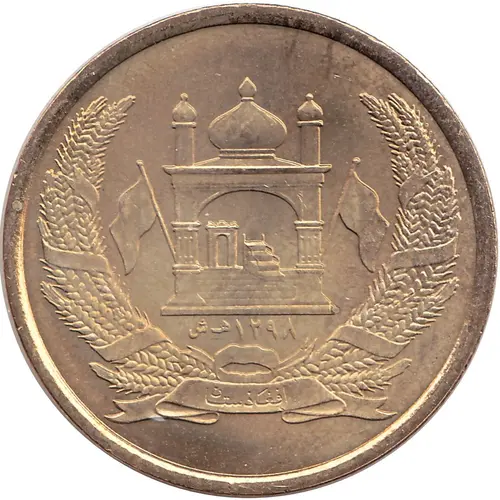 Ön yüz açıklaması Coat of arms of Afghanistan adopted in 2002 consisting in a mosque with two Afghan flags. Inside the mosque, some steps which guide to the mehrab with a prayer rug. Surrounding the mosque, sheaves of wheat linked with a sunrise and the date of Afghanistan`s independence (1298 / ۱۲۹۸) according to the Persian calendar. In the bottom, a ribbon with the name of the country in Pashto.