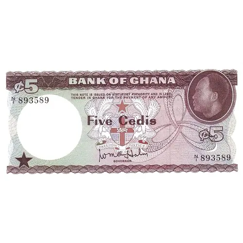 | Obverse lettering | BANK OF GHANA THIS NOTE IS ISSUED ON STATUTORY AUTHORITY AND IS LEGAL TENDER IN GHANA FOR THE PAYMENT OF ANY AMOUNT FIVE CEDIS ¢5 |