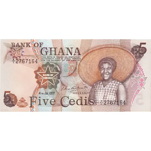 | Obverse lettering | BANK OF GHANA THIS NOTE IS ISSUED ON STATUTORY AUTHORITY AND IS LEGAL TENDER FOR THE PAYMENT OF ANY AMOUNT FIVE CEDIS 5 |
