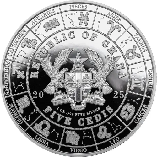 | Obverse lettering | SAGITTARIUS CAPRICORN AQARIUS PISCES ARIES TAURUS GEMINI REPUBLIC OF GHANA 2025 FREEDOM AND JUSTICE 1 OZ .999 FINE SILVER FIVE CEDIS SCORPIO LIBRA VIRGO LEO CANCER |