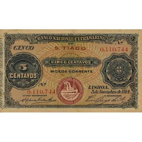 | Obverse lettering | BANCO NACIONAL ULTRAMARINO EM S. TIAGO CINCO CINCO CENTAVOS MOEDA CORRENTE LISBOA, 5 de Novembro de 1914. Bradbury, Wilkinson & Co. Ld. Gravadores, Londres (Translation: National Bank Overseas in St. Tiago Five Cents in Currency Lisbon, November 5, 1914. Bradbury, Wilkinson & Co. Ltd. Engravers, London) |