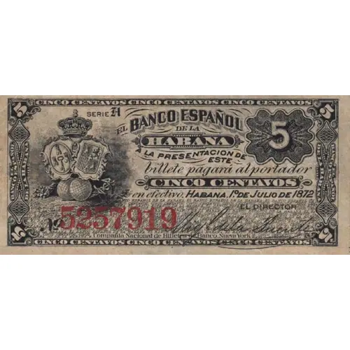 | Obverse lettering | EL BANCO ESPAÑOL DE LA HABANA A LA PRESENTACION DE ESTE billete, pagará al portador CINCO CENTAVOS en efectivo. Habana, 1º de Julio de 1872 (Translation: The Spanish Bank of The Havanna to the presentation of this banknote, will pay to the bearer five cents in cash. Havanna, July 1st., 1872.) |