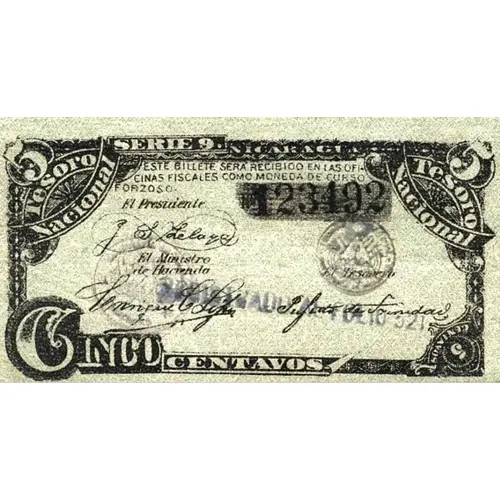Vorderseitenlegende TESORO NACIONAL SERIE 9 ESTE BILLETE SERÁ RECIBIDO EN LAS OFI- CINAS FISCALES COMO MONEDA DE CURSO FORZOSO. CINCO CENTAVOS