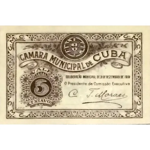 | 表面の銘文 | CAMARA MUNICIPAL DE CUBA DELIBERAÇÃO MUNICIPAL DE 31 DE DEZEMBRO DE 1919 O PRESIDENTE DA COMISSÃO EXECUTIVA VALE 5 CENTAVOS |