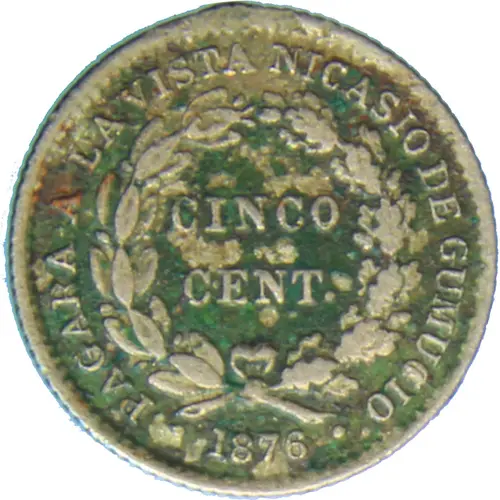 | Leyenda del anverso | CINCO CENT. 1876 PAGARA A LA VISTA NICASIO DE GUMUCIO (Translation: Nicasio de Gumucio owes five cent) |
