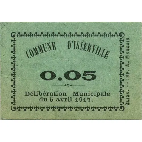 | Obverse lettering | COMMUNE D`ISSERVILLE 0.05 Délibération Municipale du 5 avril 1917 BLIDA. - Imp. A. MAUGUIN |