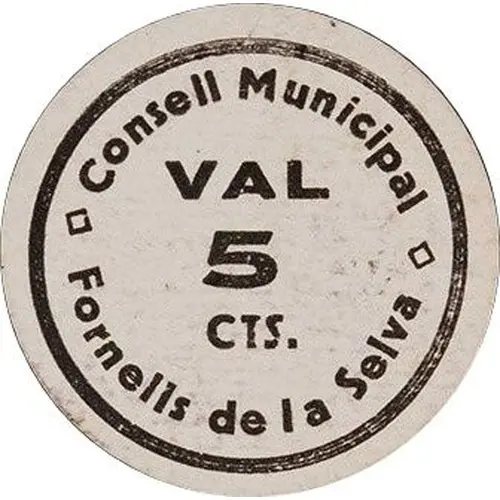 | Legenda do anverso | Consell Municipal VAL 5 CTS. Fornells de la Selva (Translation: Municipal Council It`s worth 5 Centimos Fornells de la Selva) |