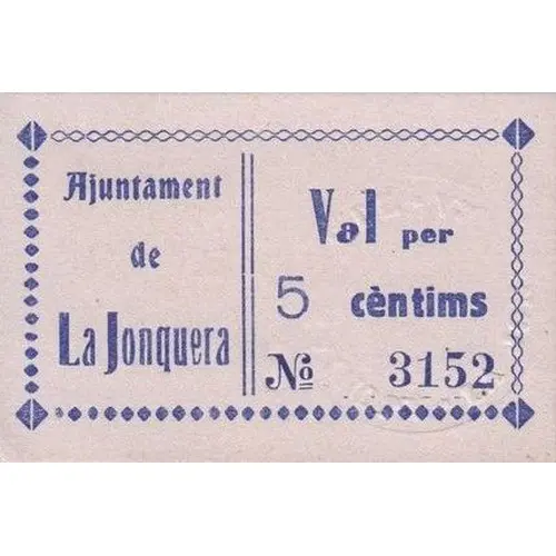 | Obverse lettering | Ajuntament de La Jonquera Val per 5 cèntims (Translation: City Council of La Jonquera Valid for 5 Centimos) |