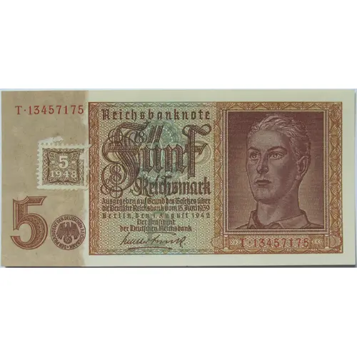 | Leyenda del anverso | Reichsbanksnote Fünf Reichsmark - 5 - 1948 Ausgegeben auf Grund des Geſetzes über die Deutſche Reichsbank vom 15. Juni 1939. Berlin, den 1. August 1942. Der Präſident der Deutſchen Reichsbank (Translation: Reichsbank note Five Reichsmarks Issued under the Law on the German Reichsbank of June 15, 1939. Berlin, August 1, 1942. The President of the German Reichsbank) |