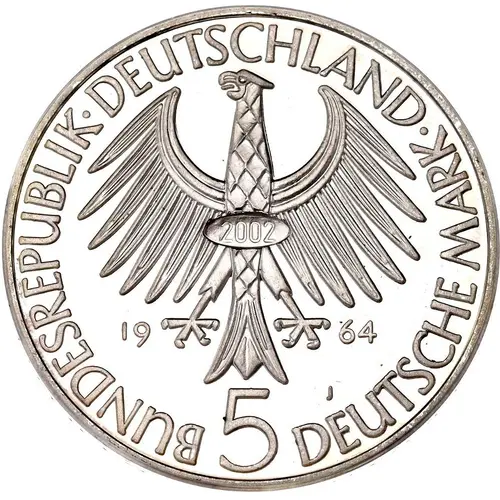| نوشتههای روی مدال | BUNDESREPUBLIK · DEUTSCHLAND · 5 DEUTSCHE MARK 19 64 J |