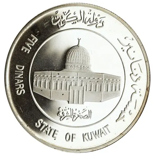 | Legenda awersu | دَولة الكُويت FIVE DINARS خمسَة دنَانير الصَخرة المشرَفة STATE OF KUWAIT (Translation: State of Kuwait 5 Dinars Dome of the Rock) |